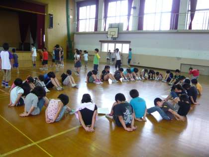 各グループが運動場や体育館、教室に分かれて