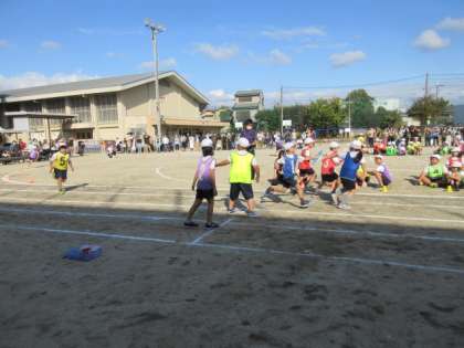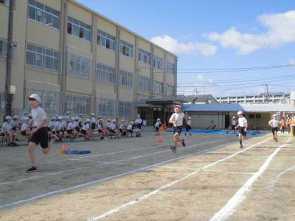 準備運動を終え,最初の競技「80m走」。コーナーリングに気をつけて,最後の一歩まで全力で走り切りました。