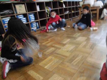 生活科「あそんで ためして くふうして」では,集めた廃材を使って,積んだり,転がしたり,はじいたりしながらもう一度遊びました。何かを作ったり,音を鳴らしたりするだけでなく,点数をつけたり,勝敗をつけたりと,前回よりルールを付け加えて遊ぶ子が増えてきました。