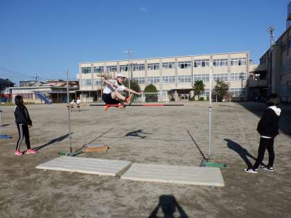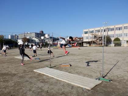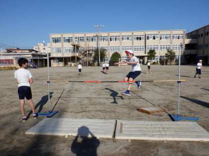 体育科で「走り高跳び」の学習をしています。リズミカルな助走から力強く踏み切って跳ぶことができるようになりました。友達が跳べた時には,一緒に喜ぶ姿もすてきです。