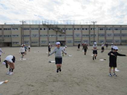 鉄棒の学習と合わせて「なわとび」の学習もしています。短なわでは,自分のめあてに向かって,一つでも多くの技を,一回でも多く飛べるように頑張っています。長なわでは,グループで八の字跳びに挑戦。なかなか縄の中に入れない友達に,一生懸命入るタイミングを声かけしている姿がほほえましかったです。