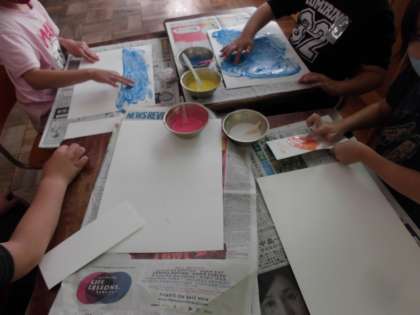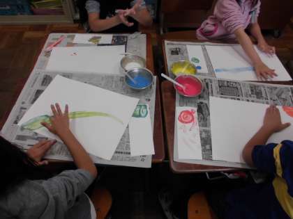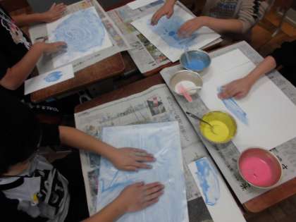 図画工作科「とろとろえのぐでかく」では,液体粘土に絵の具を混ぜたものを,指や手でのばして色付けしていきました。山や海,宇宙といったイメージになるように色を混ぜて作り,自分だけの世界を作り上げていきました。