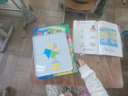 教科書の見本をよく見ながら,色板を回転させたり,ひっくり返したりして同じような形を作りました。