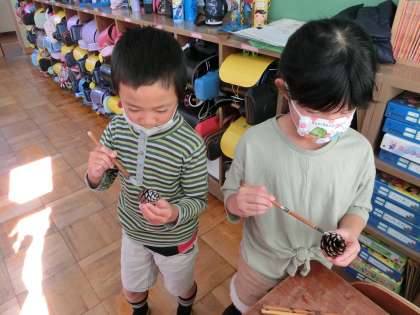 どんぐりや松ぼっくりに色を付けたり,つける場所を工夫したり
