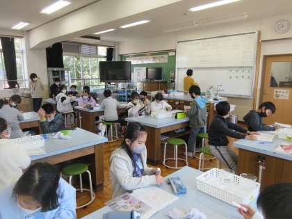 この日の理科は理科室で行われました。めったにない理科室での学習で,しかも実験をするということで,子どもたちは大喜びでした。