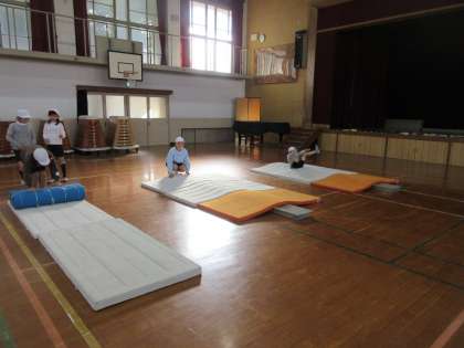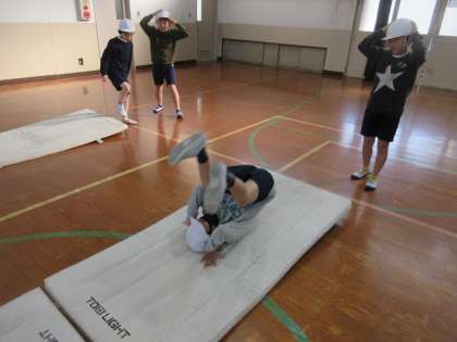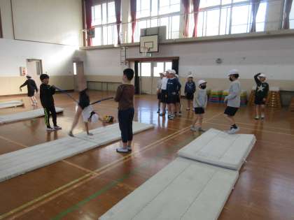 この日はねらい2で,マットに長いすをはさんで真ん中を高くしたり,踏切版をはさんで坂道を作ったりするなどして,できる技を増やすためにいろいろな練習の場を作って練習しました。