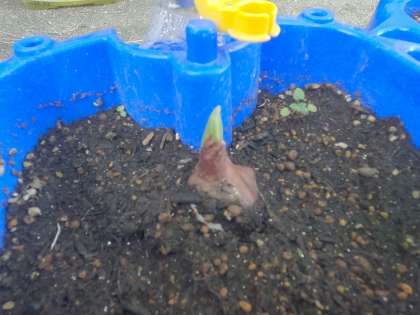 以前,女性会の方々と一緒に植えたチューリップの球根から芽が出ました。春先にどんな色の花が咲くのか,いまから楽しみです。