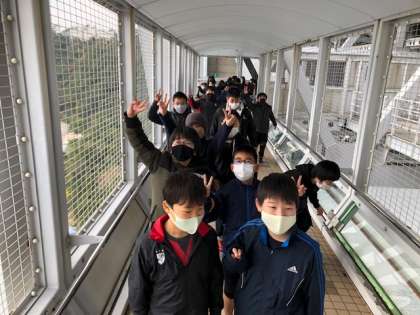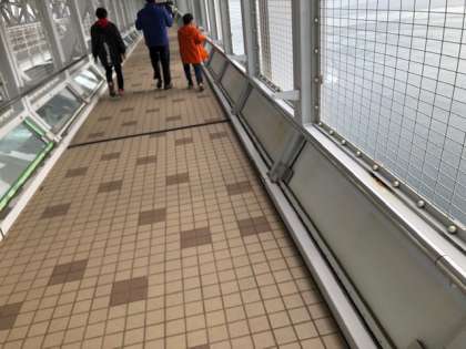 渦の道を歩いています。とても高い位置にある遊歩道で少し恐がっている人もいますが、潮風がとても気持ちいいです。