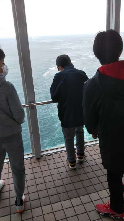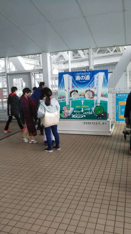 予定通り大鳴門橋渦の道に到着しました。天候は、薄曇りで海からの風は冷たいですが、子どもたちは元気に、足元から見える潮の流れや、眼下に広がる海を堪能していました。