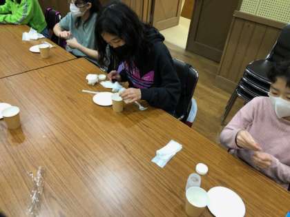 固体と液体に分離したら、液体を紙コップに移し、固体を紙皿に移します。固体にはまだ水分が含まれているので、フォークで液体を抜いていきます。