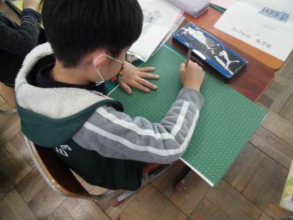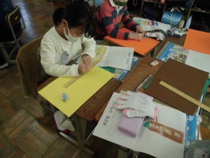 図画工作科「まどをひらいて」では,カッターナイフを使って画用紙にいろいろな窓を作っていきました。両開きや片開き,面白い形に開く窓など,いろいろな開け方の窓を作っていきました。