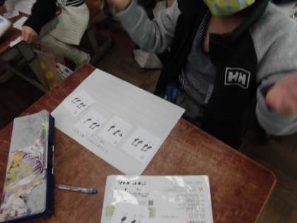 音楽科「くりかえしを見つけよう」では,いくつかのリズム打ちのカードを組み合わせて,音楽づくりをしていきました。同じカードを2回使うことで,まとまりのある曲に仕上がることがつかめました。