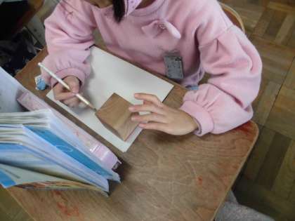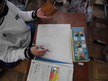 算数科「はこの形」では,箱の面を紙に写し取りました。写し取った面を見ることで,箱の面が長方形や正方形になっていることや面が6枚であること,同じ形の面があることなどに気付くことができました。