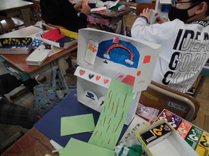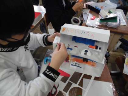 図画工作科「ともだちハウス」では,自分が作った友だちが喜ぶおうちを作りました。どんな家具がいるか,どんな色にすればよいか,一人ひとりが思い思いの作品作りをしていきました。