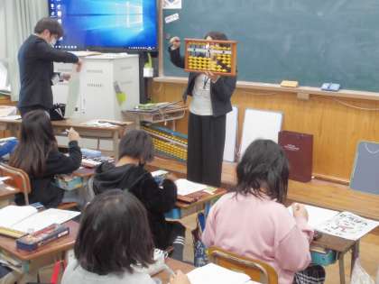 全国珠算教育連盟からお二人の先生に来ていただき,そろばんの学習をしました。1日目のこの日は,初めてそろばんにさわる子がほとんど。