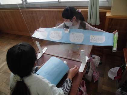 生活科「広がれ わたし」では,自分の成長をずかんや絵巻物,ペープサートにしてまとめました。まとめたことを友だちと交流する中で,一人ひとり,いろいろなことができるようになってきたのだと,成長を実感することができました。