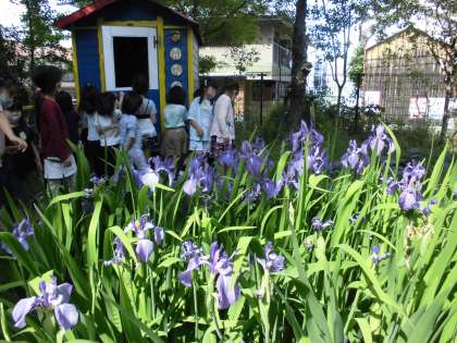 先日,アサガオの種をまいたばかりの子どもたち。今の季節,吉祥院小学校にはどんな花がさいているのか,たしかめに行きました。東の森の池に咲いていたカキツバタや蓮の花に見とれたり,よく見ないと分からないような小さな小さな花に気付いたり,いろいろな発見がありました。