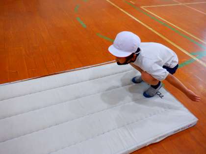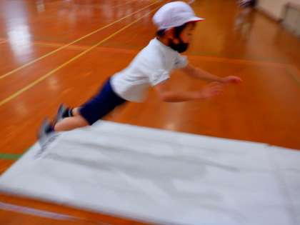 新体力テストで「立ち幅とび」をしました。両手をうまく使って,遠くにジャンプできるようにがんばりました。