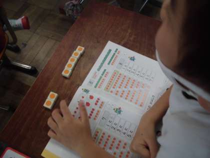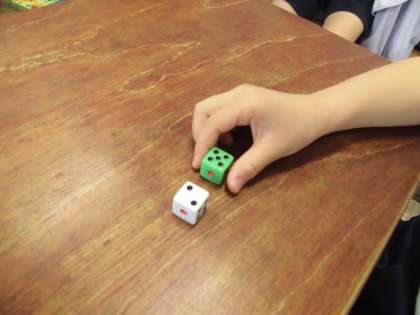 この日は7がいくつといくつになるのかを調べました。そして学習の定着を図るために,サイコロを二つ用意して,両方を一度に投げて,7になる組み合わせを確かめたり,一つ目のサイコロを投げたあと,7になるためには,もう一つのサイコロは何の目が出ればよいか考えたりしました。
