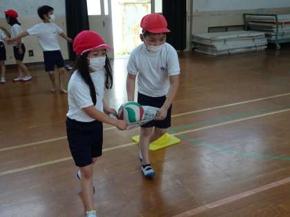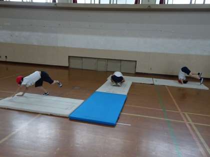 体育科で体つくり運動をしました。友達と協力してボールを運んだり,マットで前転や後転運動をしました。普段から自分にできる運動を生活に取り入れて丈夫な体を作ってほしいと思います。