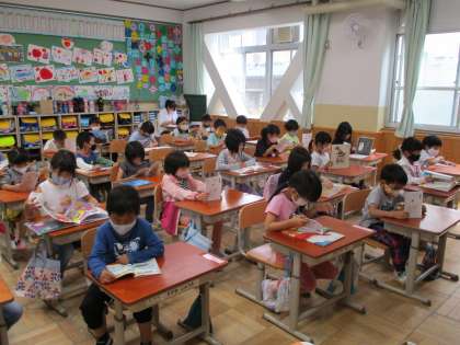 図書館の利用もはじまり,はりきっている子どもたちです。