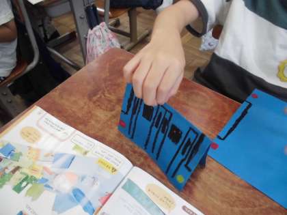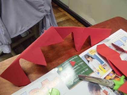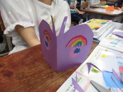 紙を折って立ててみました。切ったり,描いたりするといろいろなものができあがりました。