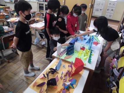 いろいろな立たせ方に気付くと,いろいろな作品が出来上がってきました。作ったものをならべてみんなで見せ合いました。