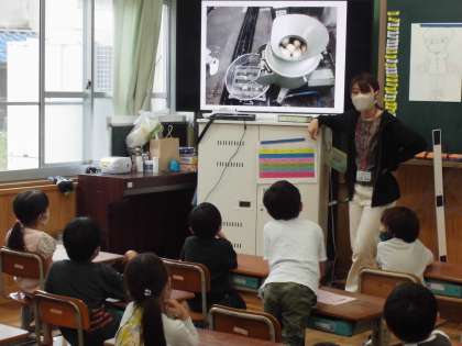 栄養教諭の木原先生に,給食のひみつを教えてもらいました。給食室のバックヤードを知っている木原先生ならではの情報をたくさん教えてもらって大喜びの子どもたちでした。たまねぎの皮はどうやってむいているのか,調理員さんは何枚のエプロンをもっているのかなど,動画や絵を使って分かりやすく教えて下さいました。