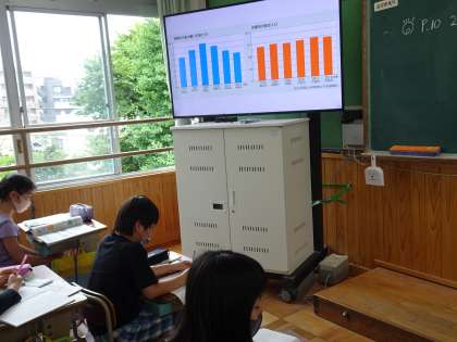 社会科で京都市で使われる水の量について考えました。2つのグラフから分かることや考えられることを読み取りました。一日で使われる水の量の多さに子どもたちは驚いていました。