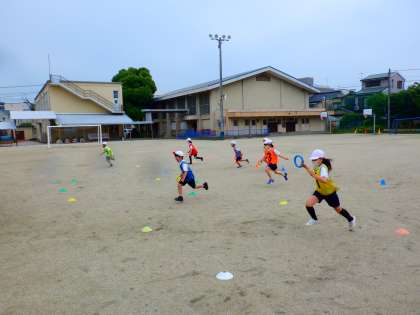 体育で『リレーあそび』をしました。次の人に輪を渡そうと,頑張って走っていました。
