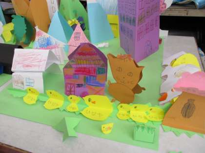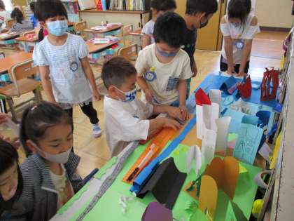 紙をおってたてて,作ったもので まちをつくりました。