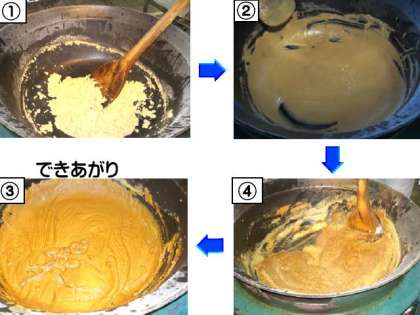 今日は子どもたちの大好きなカレーでした。いつもはおかわりしない子どもたちもカレーの時はすすんで食べてくれます。給食のカレーのおいしさのひみつは「手作りルー」です。1 釜にサラダ油を熱してバターを溶かし小麦粉を入れ炒ります。2 しばらくすると滑らかになり3 よく炒りつけると香ばしい香りとともに茶色くなってきます。4 カレー粉、脱脂粉乳を入れよく炒ると出来上がりです。この工程をじっくり時間をかけて行うので美味しいカレーになります。