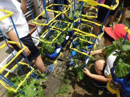 アサガオのつるが伸びてきたので,支柱をたてました。追肥もして,これからの成長がますます楽しみな子どもたちです。