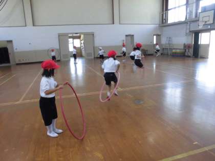 じゃんけんをして,勝ったら進める「じゃんけんとびあそび」やフラフープをなわとびのようにしてとぶ「フラフープなわとび」をして遊びました。幼稚園や保育園で経験している子どもが多く,フラフープを上手に腕で回してとんでいました。経験のない子どもには友達が「こうして回すといいよ」と教えていました。
