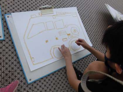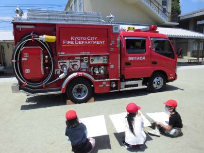 火災の避難訓練に合わせて,消防車が吉祥院小学校に来てくれました。本物の消防車に子どもたちは大興奮。大きな画用紙に,大きな消防車をよく見てかきました。今日は短時間だったので,大まかな形をとらえるところまででしたが,来週,クレパスでしっかりとかいていきます。