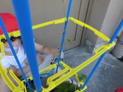支柱を立てたばかりのアサガオをスケッチにいきました。大きな葉っぱを触ってみると,チクチクといっぱい毛が生えているのに気が付きました。「何もしていないのに,ツルが支柱にまきついてる!」と驚きの様子の子どもたちでした。