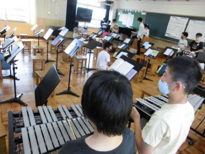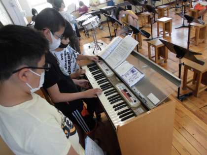 オルガンの音をもとに,木琴や鉄琴,低音楽器のバスマスター,タンバリン,小太鼓などのいろいろな楽器の音が重なり合うひびきを楽しみながら,演奏しています。各グループで,楽器の組み合わせを工夫して,練習中です。