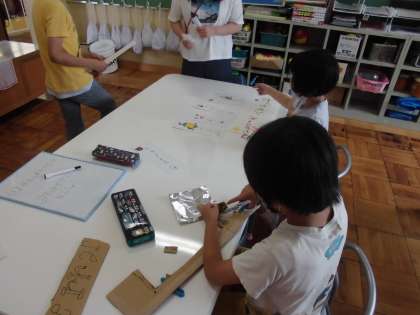 作った商品と看板を並べ,お店屋さんを開き,クラスに分かれて練習しました。