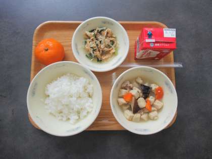 ごはん・高野どうふと野菜のたき合わせ・もやしの煮びたし・みかんでした。