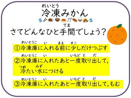 冷凍みかんはただ単に凍らせただけではなく,みかんの乾燥を防ぐためにあるひと手間をかけています。あるひと手間とは何でしょう?