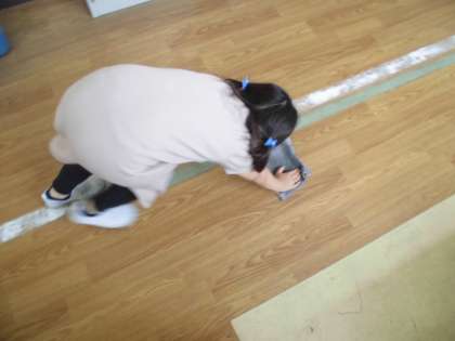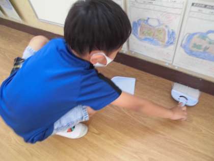 たくさんの人が行き交う1年生の教室前廊下。丁寧に掃除をする様子が光っています。隅々までゴミを集める姿,何度も行ったり来たりして拭き上げる姿は,きれいにしようとする気持ちであふれています。