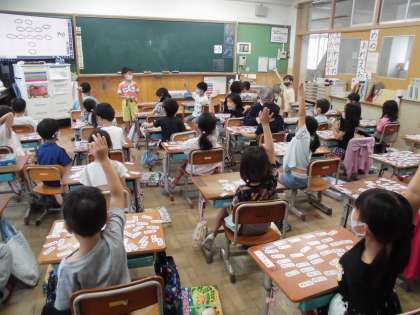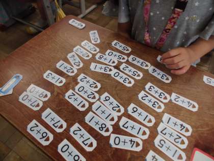 たしざんカードを使って計算の練習をしました。式が書いてある方を机に並べて,答えが10になるカードを探します。これだと思うものをめくって「10」と書いてあると,大喜びの子どもたちでした。そして,自分がみつけた「答えが10になる式」を発表しました。手をピンと挙げて,自分が指名されるのを静かに待っています。