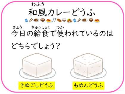 絹ごし豆腐はつるんとした食感の豆腐,木綿豆腐はしっかりとした食感の豆腐ですが,今日の給食で使っていた豆腐はどちらの豆腐でしょう?