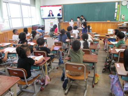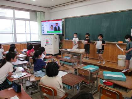 生活科の「なかよしいっぱい だいさくせん」のお勉強で,学校の先生にインタビューに行ってきました。聞いてきた内容を,みんなに紹介している様子です。