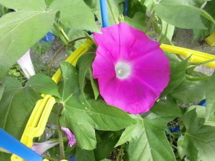アサガオの花が咲き始めました。薄い色や濃い色など,花びらの色は花によって様々です。次はだれのアサガオの番かなと楽しみにしている子どもたちです。