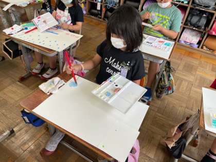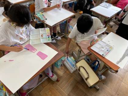 図画工作科の「わたしの6月の絵」の単元で,6月のイメージを絵具で表現しました。絵具で表現する際には「色」や「表現の仕方」を大切にしました。水を多くいれてぼかした色にしたり,水の上に絵具を乗せてにじませたりと,いろんな工夫が見られました。