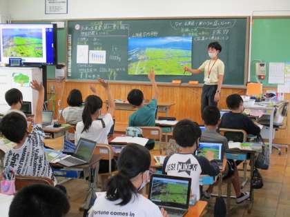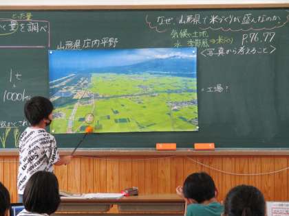 5年生の社会の授業で,庄内平野の米づくりについて学習をしています。今日は,GIGA端末(タブレット)と教科書等を併用して,庄内平野では「なぜ米づくりが盛んなのか?」について,写真をもとに気づいたことを,自分のことばで発表していました。今日の授業は,今年度本校が取り組んでいる情報収集能力の育成を目指し,言語活動を通して課題解決型の学習をすすめる授業の一つです。