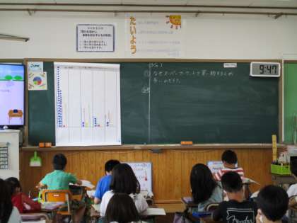 おうちの人に協力してもらって買い物調べに取り組んだ子どもたち。この日の学習で,それぞれが調べたことを持ち寄り,どこで買い物することが多いのかをグラフの形にしてみました。「スーパーマーケットで買い物する人が多い」ことにすぐに気がつきました。
