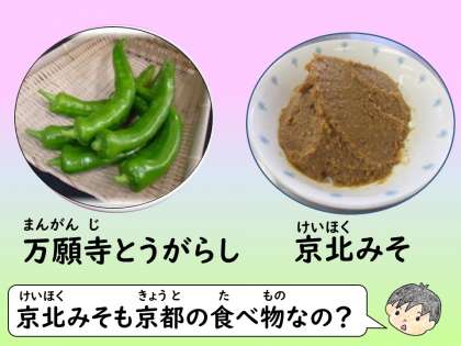 京都市の小学校給食では月に一度,和食をあじわう日として“和献立の日”を設けています。今月の和献立では京野菜として知られる,“万願寺とうがらし”や,京北地域で作られた”京北みそ”を使っており,“地産地消”に関する動画を給食中に流しました。