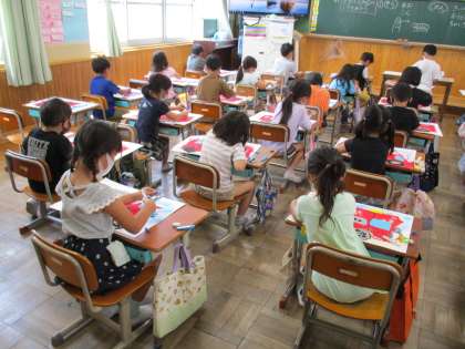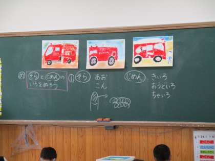 先日実施した避難訓練時に,消防車が一台来ました。避難訓練後1年生は写生会で消防車を写生しました。その写生した消防車に色づけをしています。今日は,コンテをはさみで少し削って粉にしたものを指でこすって青空を描いていました。指先を真っ青にして,無心に色づけをしていました。なかなかな力作揃いです。